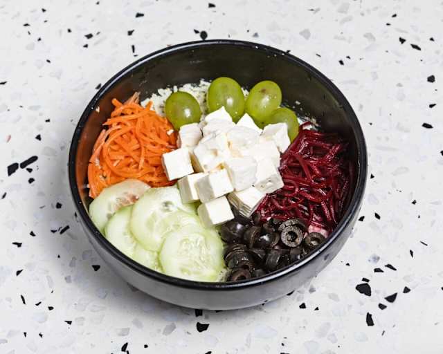 - Aromático arroz basmati, acompañado de queso feta, uvas, remolacha encurtida, pepino, zanahoria, aceitunas negras, y nuestro aliño de menta y yogur.