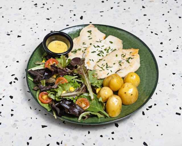 - Pechuga de pollo fileteada al horno, bañado en salsa chimichurri, acompañado de patatas asadas y ensalada de brotes tiernos, tomate, rábano y aceite de oliva