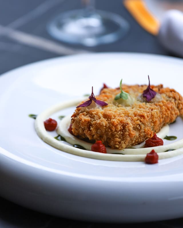 Baccalà pastellato, patata duchessa al timo e mayo al basilico