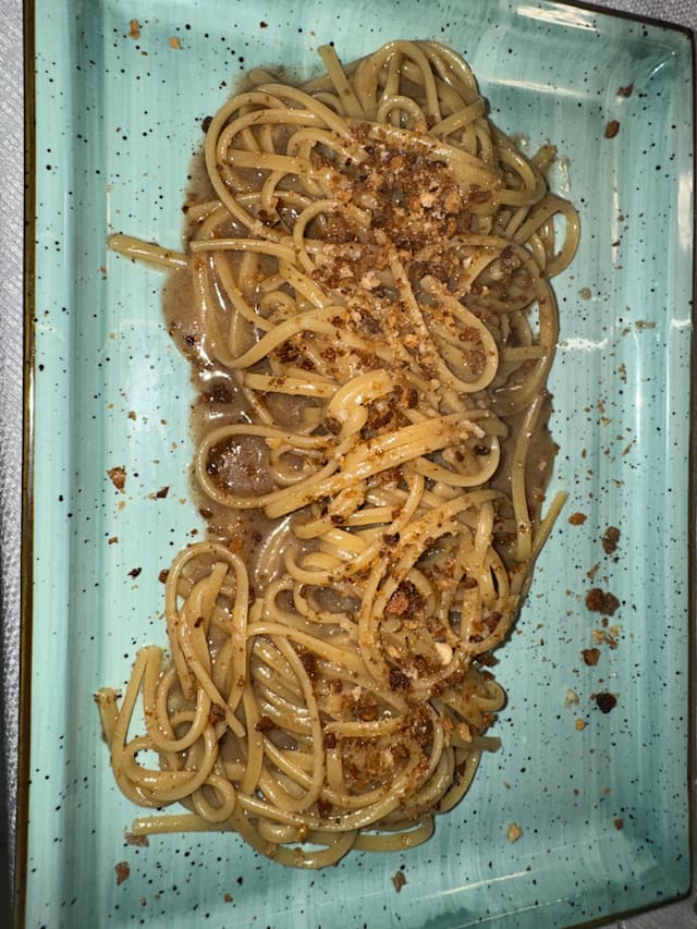 Linguine al burro noisette, alici e crumble di pane con essenze di erbe aromatiche
