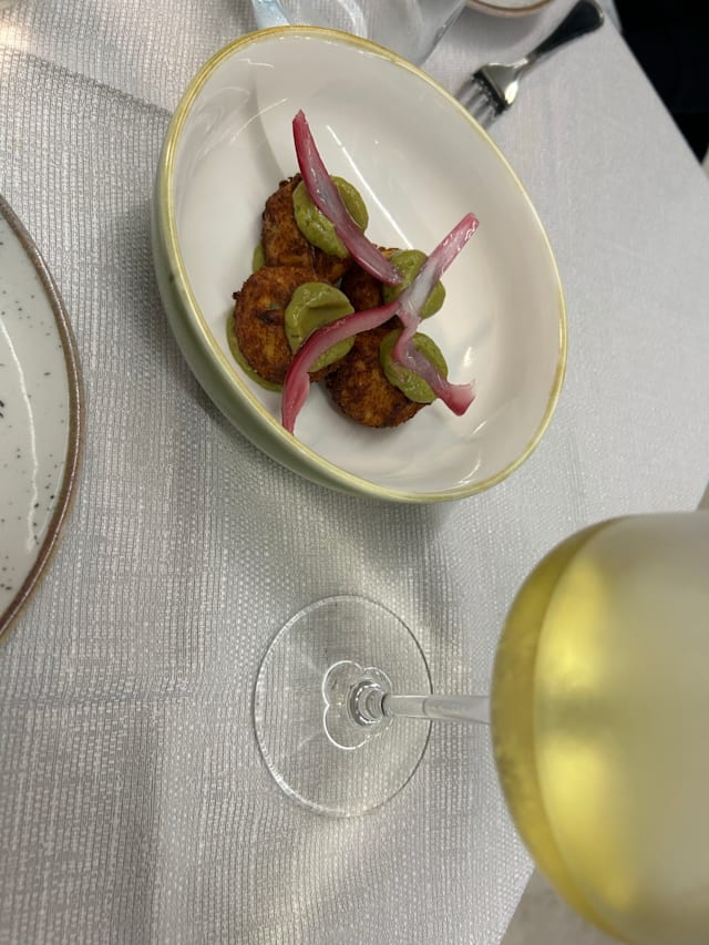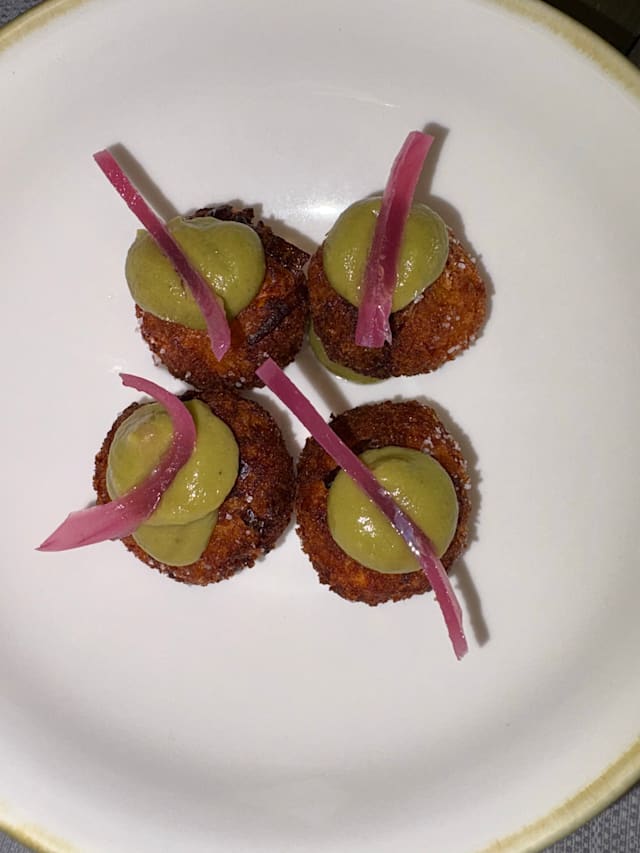 Polpettine di salmone su crema di avocado e cipolla chutney