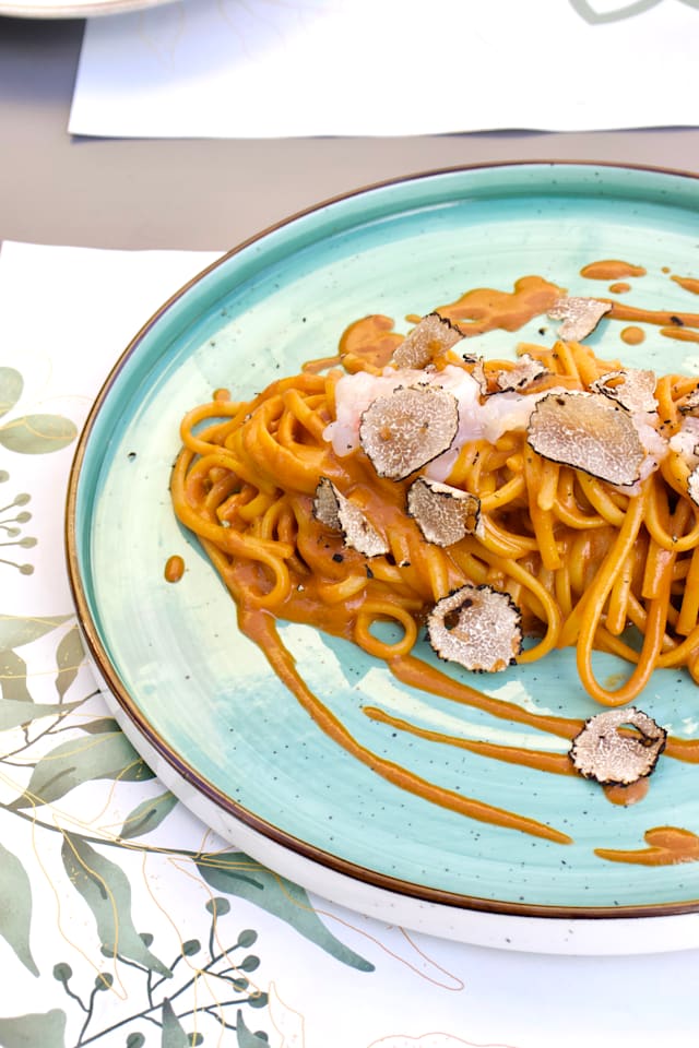 Spaghettone aglio e olio mantecato al tuorlo d’uovo marinato