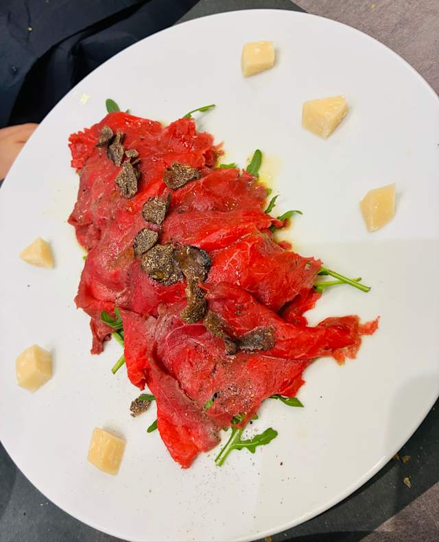 - Carpaccio di manzo con tartufo stagionale e parmigiano reggiano 48 mesi