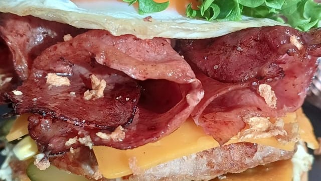 - 2 x hamburgueres artesanais, 4 x queijo cheddar, bacon, aros de cebola, ovo estrelado, alface