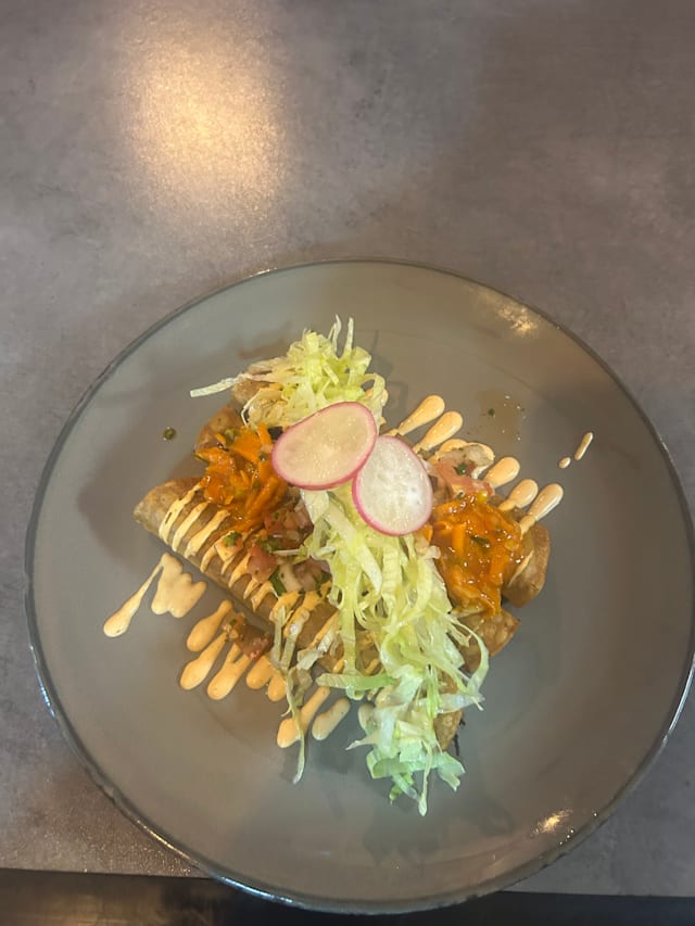 Tortilla dorada rellena de pollo, verduras salteadas y queso fundido.