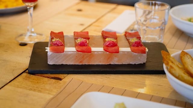 - Tártaro de salmão, batata doce crocante e arroz de sushi
