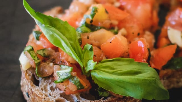 - Pão, tomate com azeite, manjericão, alho e oregãos