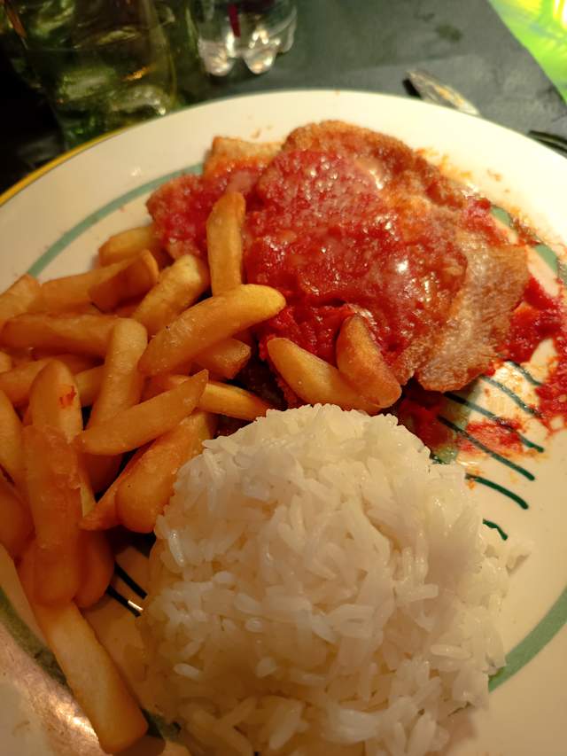 - Filetto di petto di pollo alla milanese con pomodoro e parmigiano, riso basmati e patate fritte