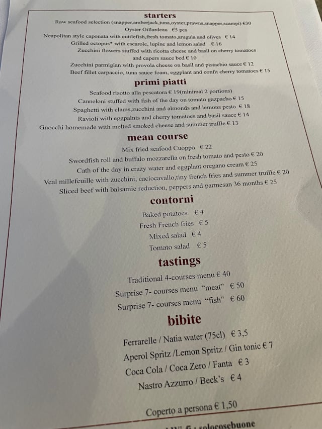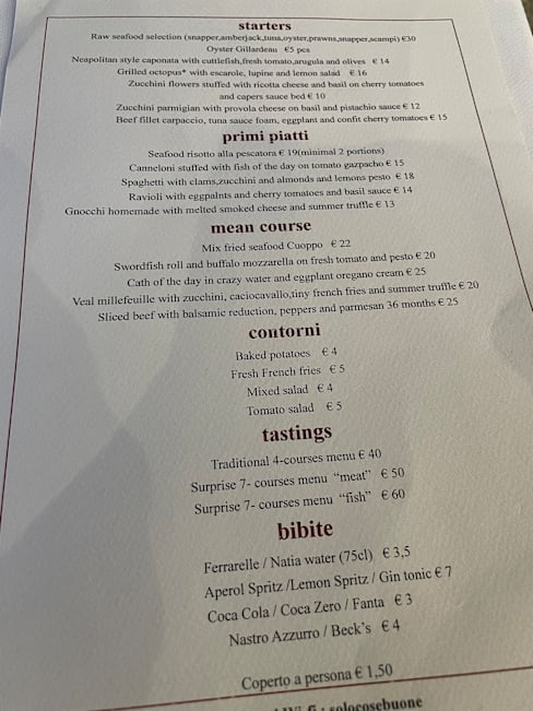 10/10The tasting menu of seven dishes plus dessert was a delicious presentation of local products from sea and land all elegantly served by waiters with great knowledge shared discreetly throughout the meal. The local wine from Ettore Sammarco was recommended and enjoyed. Truly a great evening priced way belove its value.