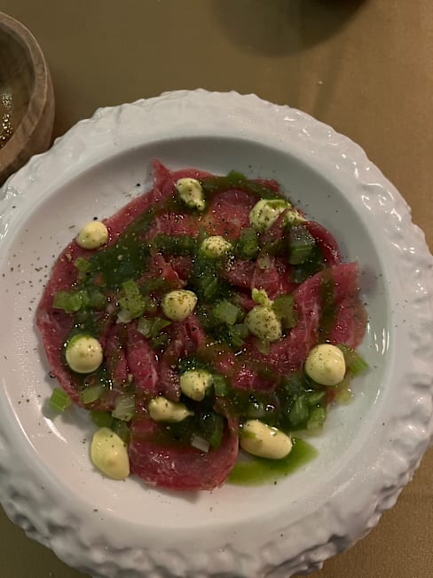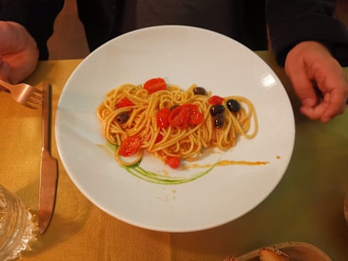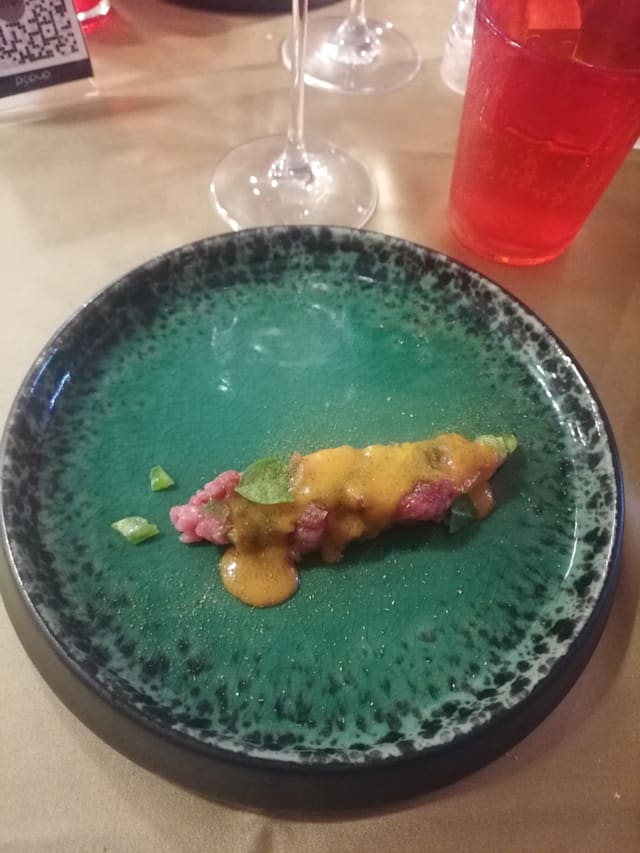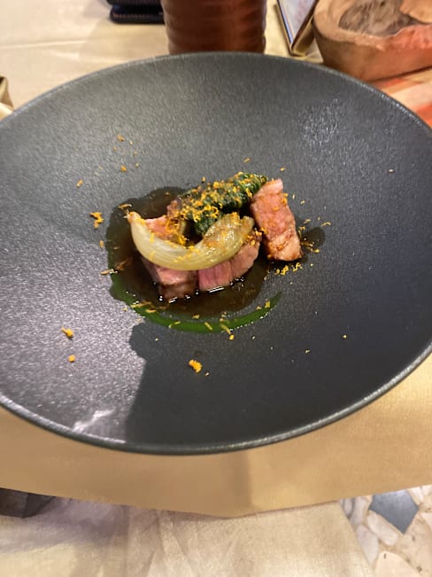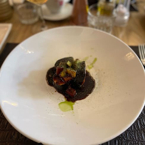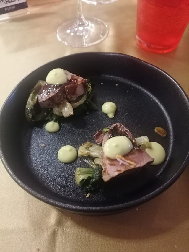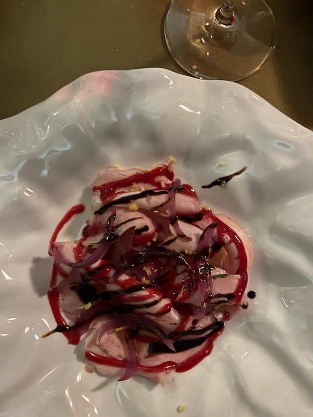 6/10Service was decent…. Meals for the three of us came out of the kitchen reasonably close together though not at the same time. The menu was disappointing. With a Michelin recommendation I had hoped for better. They get points for a menu that wasn’t the usual Abruzzese fare and each of us thought something was good. I had the suckling pig, which was flavorful and had a great crispy outside. But the raspberry sauce was not a good flavor match for it and the red onions had absolutely no taste at all.