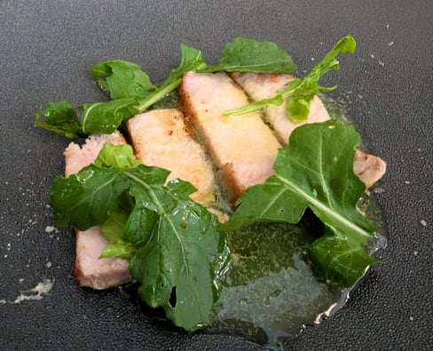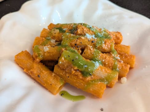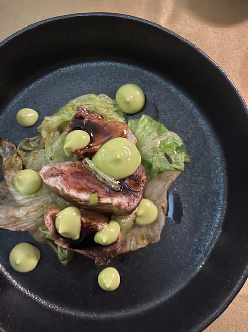 5/10Pasta with ragu, was tomato heavy, dry suckling pig roll with cold raspberry mash and cold onions. Strange combination.