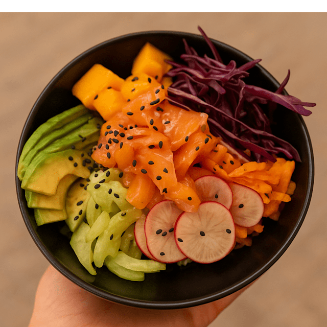 Arroz con salmón ahumado, mango, papaya, aguacate y vegetales crujientes.