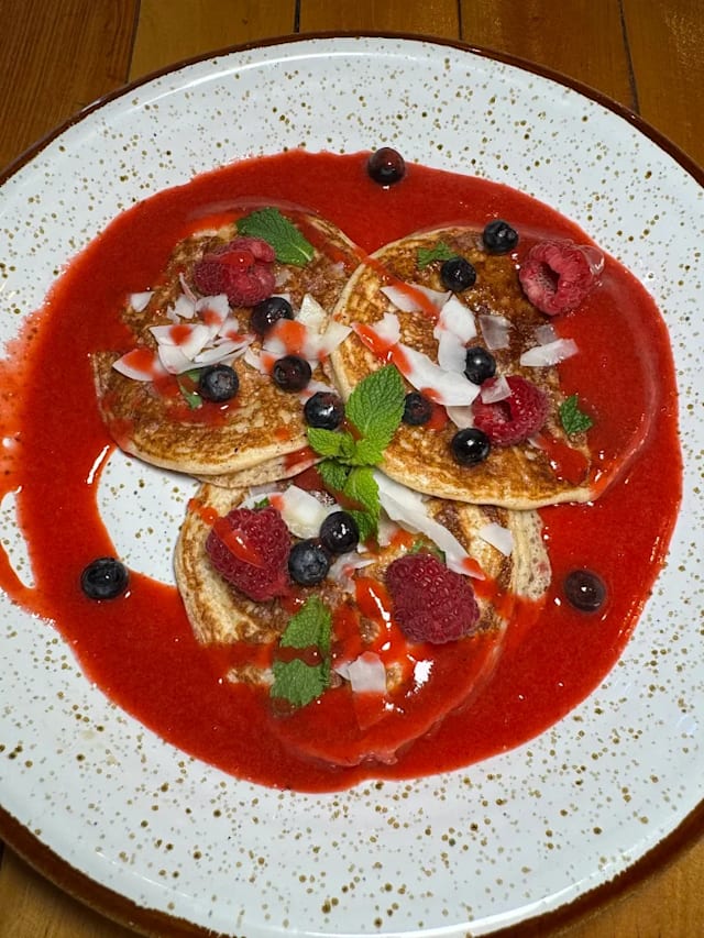 Pancakes aireados servidos con sopa de fresas fresca, escama de coco y frutos...