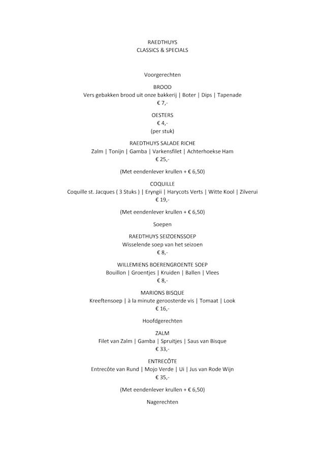 Located in the Achterhoek is the atmospheric restaurant 't Raedthuys. Enter into an intimate atmosphere for a delicious dinner. 't Raedthuys has a wide range of delicious dishes, so for everyone something to eat! Fine cuisine, where seasonal products play a major role....