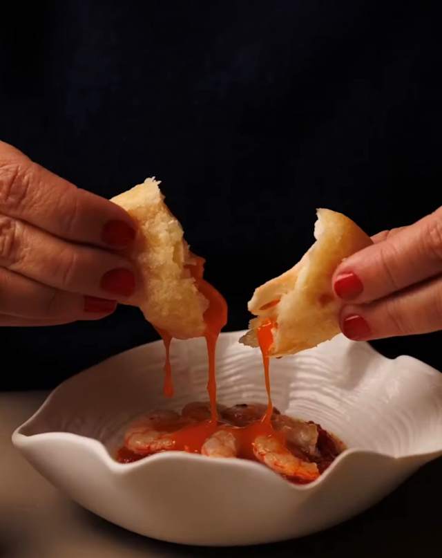 - Guiso de tomate, gamba y bollo preñao de yema