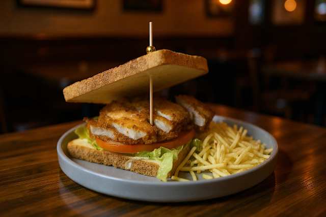 - Tres pisos de pollo, bacon ahumado, tomate, jamón york, lechuga y mayonesa. Acompañado de patatas fritas