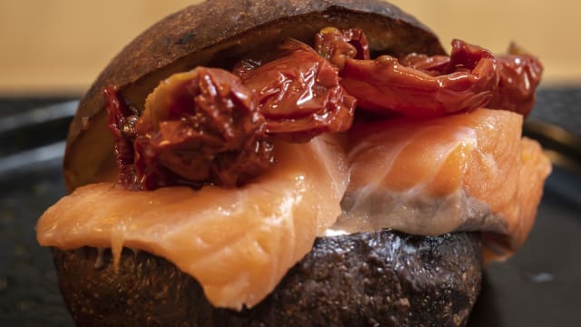 Pan brioche salato con burro della normandia e alghe marine servito con alici acqua pazza cetara o con salmone affumicato lock fine