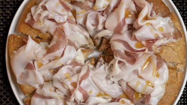 Fetta di focaccia al padellino con sella di san lorenzo (salume di maiale nero)