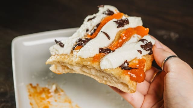 Pizza fritta con ricotta di bufala, confettura di albicocca, cioccolato