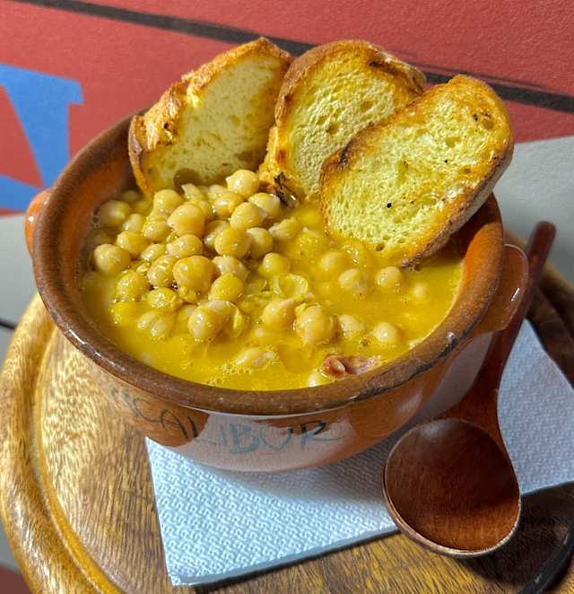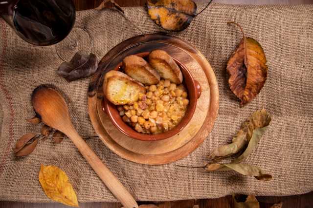 - (Ceci, salsiccia di norcia, crema di zucca, pane tostato)