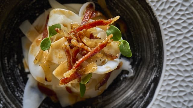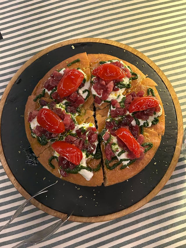 Con cipolla di tropea alla giardiniera, spinacini e basilico fresco