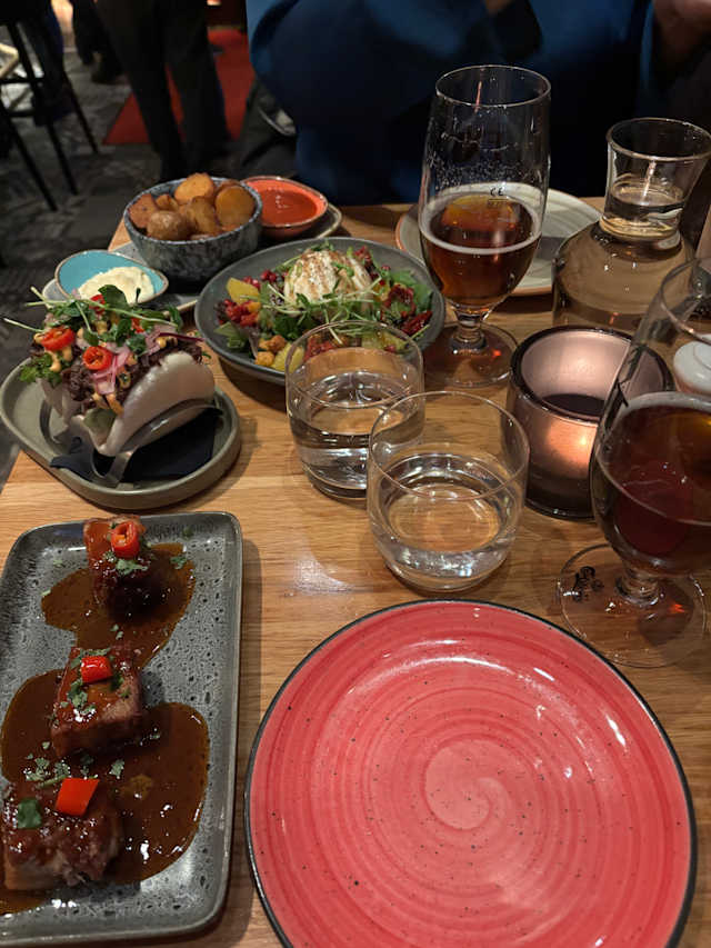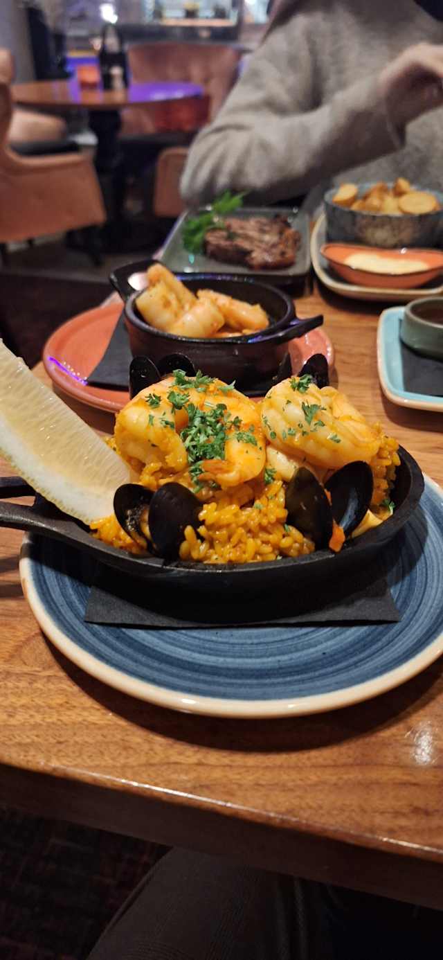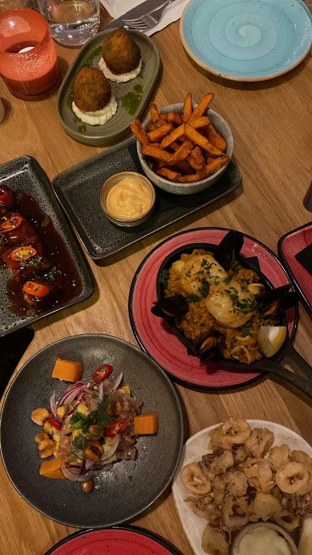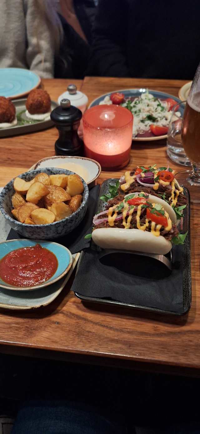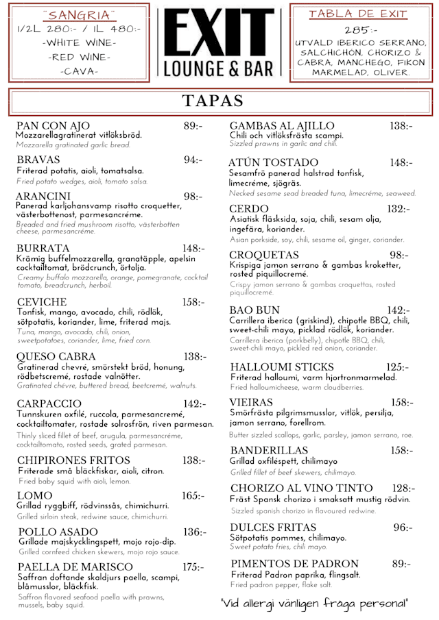 10/10We were pleasantly surprised by The Exit Lounge & Bar! Generally when I see ”bar”, we instantly think the food is secondary and ”bar food” meaning low quality, reheated, etc. We haven’t tried that many Tapas places in Stockholm, but I would say their tapas was quite similar to what we had in Spain which is a good thing ofc. They were super fast to serve and all of them were good. We ordered 10 Tapas and one Halloumi burger. The servings are fairly small, but some like the Paella is actually a good quality for 2-3 people and quite filling. The pork belly is really well made, very soft, but still a bit crunchy and grilled. The sweet potato fries were very fresh and hot, straight out of the frier. They know how to fry them in order to not be soggy and oily. They were just perfectly salty and crunchy enough. All in all I would highly recommend it, the huge amount of reviews they have are real and justified. We would gladly eat here again.