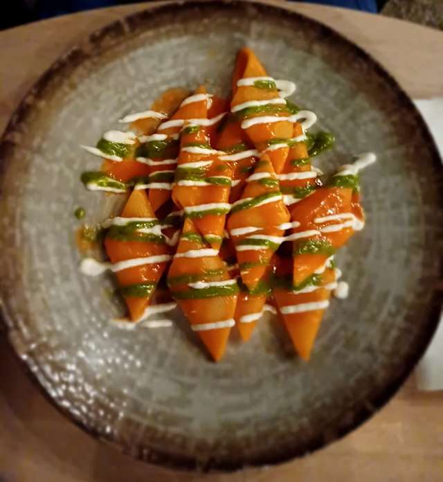 - Crema di datterino giallo, caprotto grattugiato, olive e limone