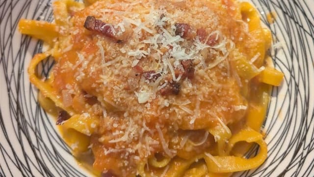 Pasta espaguetis con cebolla, tomate, bacon y queso romano