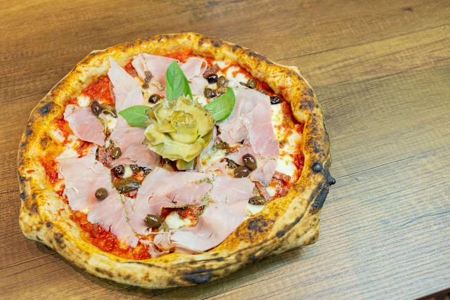 Pomodoro san marzano solania, fior di latte dei monti lattari, funghi champignon, olive taggiasche, carciofi sott’olio, prosciutto cotto fiorucci, salame napoli, olio evo