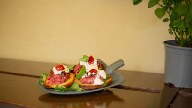 Tartare di fassona, rucola, carciofi d'Albenga, scaglie di grana, pepe, olio EVO