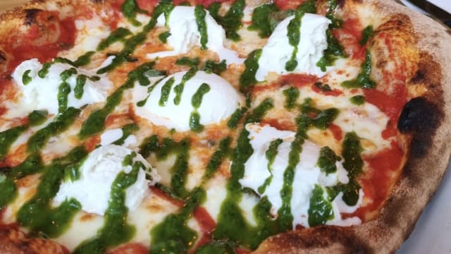 Sauce tomate, veganella (substitut de mozzarella à base de noix de cajou), basilic frais, sauce basilic maison