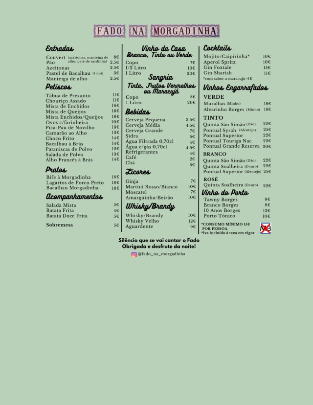9/10Great Fado music and ambiance. Very good food and excellent service!