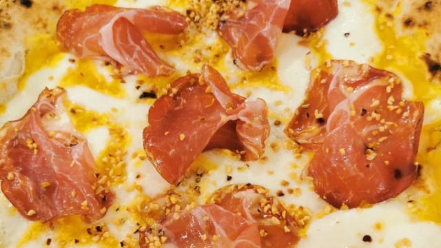 Fiordilatte, mortadella, stracciatella, con bordo ricoperto di polvere di pistacchio, crema di pistacchio di bronte, basilico, olio evo