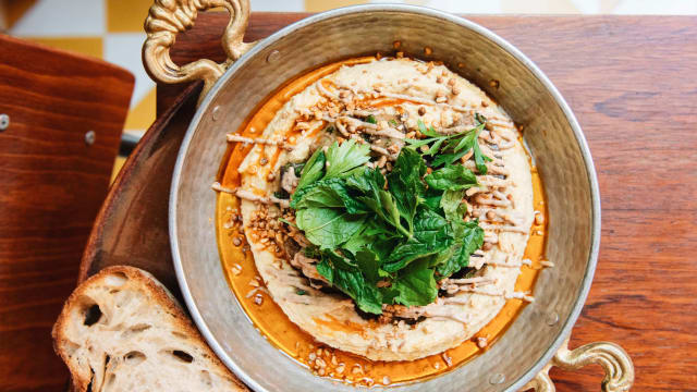 - Creamy chickpea hummus with roasted eggplant topped with lemon tahini sauce, mild chili oil, and almost dukkah, served with sourdough bread from pana ma.