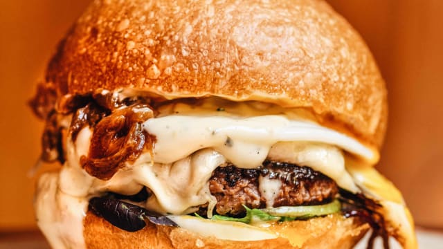 - Probably the most delicious beyond burger you’ve had! Beyond meat, melted cheddar, sunny side up egg, red onion slices, and homemade sauce. Served with sweet potato wedges and herb mayonnaise.