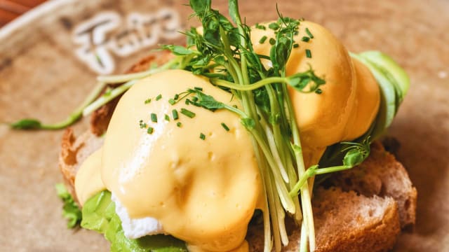 - 2 organic poached eggs topped with homemade hollandaise sauce on a bed of sliced avocado with two delicious grilled vegan bacon slices served on origo’s famous organic sourdough bread and spicy togarashi served on the side.