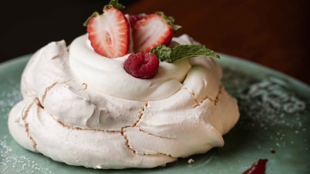Pavlova con crema batida, bayas frescas y coulis de frambuesa casero