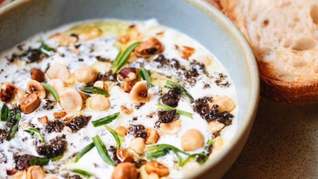 Deléitate con la deliciosa fusión de sabores de nuestra tortilla con cebolla caramelizada, champiñones y trufa, una opción cálida y acogedora que destaca en nuestra carta de tapas nocturnas.
