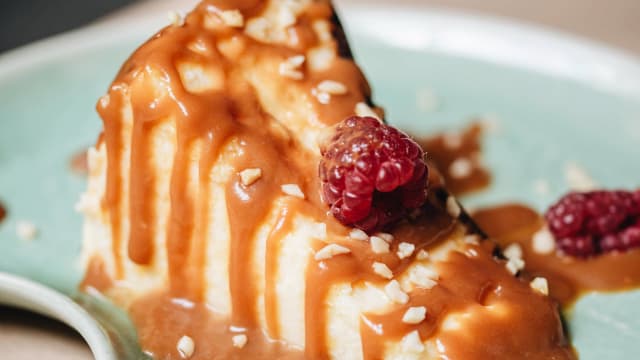 - Tarta de queso extra cremoso con salsa casera de caramelo salado y almendras tostadas +bola de helado de vainilla