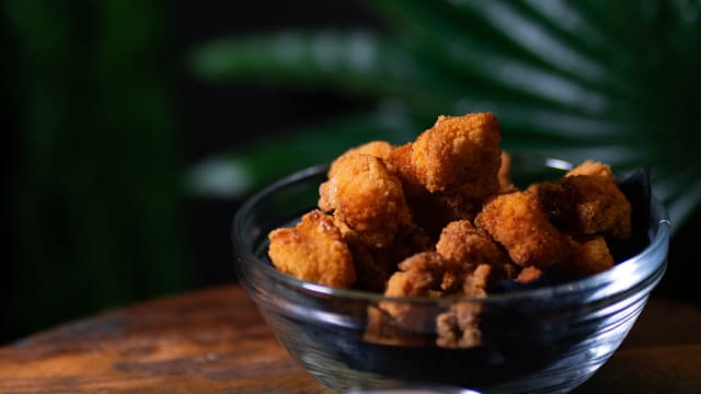 Petto di pollo a tocchi impanato e fritto accompagnato da maionese alla paprika.