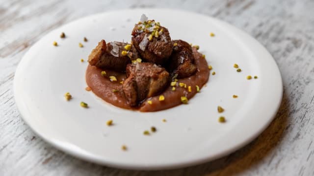 Stufato di manzo francese cotto nella birra e caramellato su crema di patate e porri.