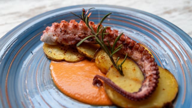 Polpo brasato a tocchi su purè di patata viola e scalogno bruciato con chips di patata dolce.