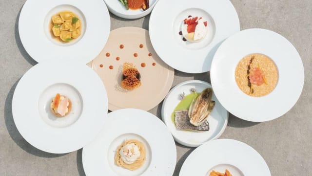 Branzino, pappa al pomodoro, crostino, mont blanc affumicata
