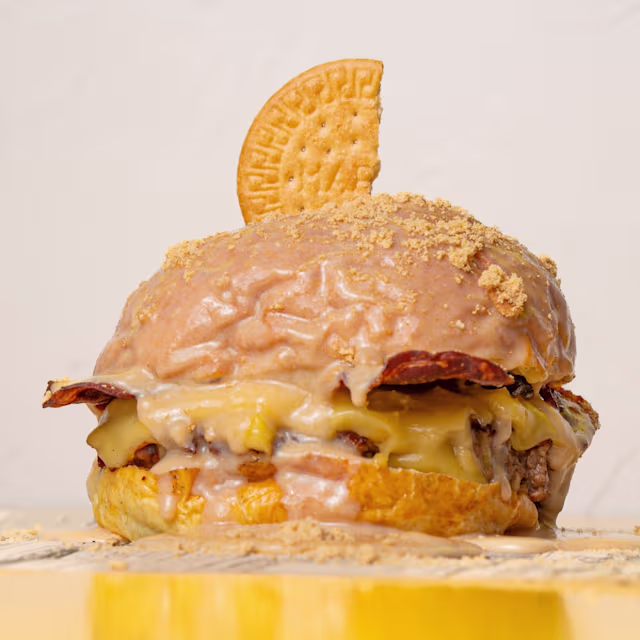 - Para los más golosos, pan brioche de patata, 200 gr de carne de vaca dorada, doble queso gouda, bacon, cebolla caramelizada, crema de leche condensada y galleta maría.