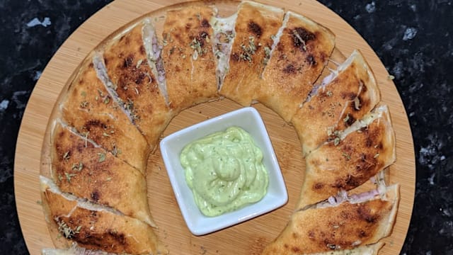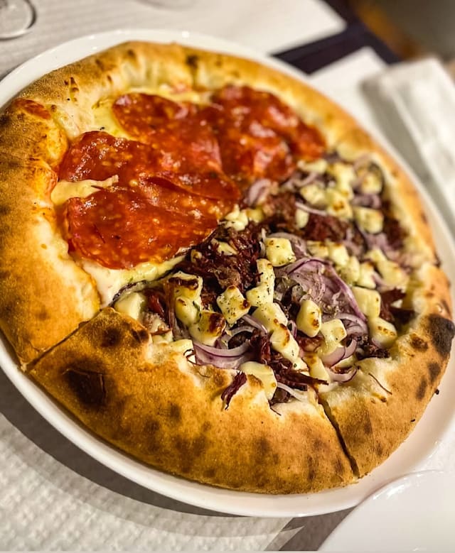 Pão brioche, hambúrguer bovino artesanal de 180g, 50g de costela desfiada, queijo prato, mussarela empanada, cebola caramelizada, bacon, tomate e alface.
