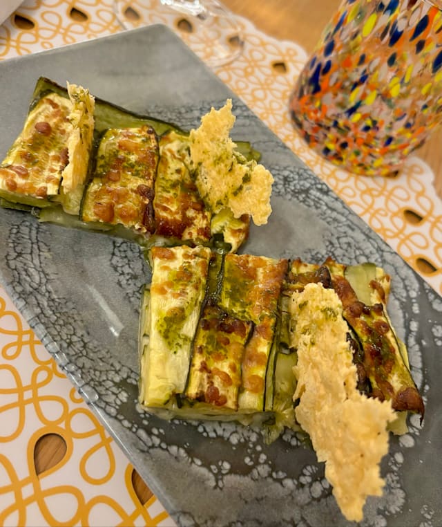 Millefoglie di zucchine con crema di mango olio alla menta e cialda di parmigiano