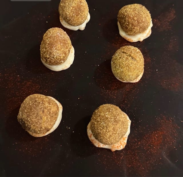 Tartaten mignon al sesamo ed al carbone alimentare farcito con creme di formaggio e pomodori gialli e rossi confit