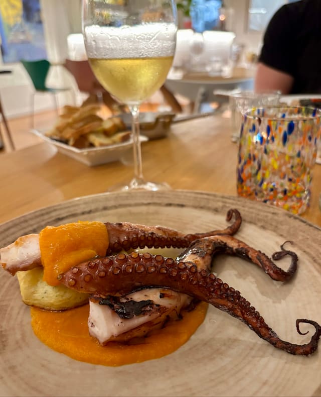 Calamari piastrati su crema di topinambur e fagottino di verdure