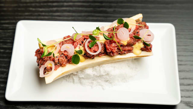 Tartare di manzo condita all'orientale, cipolla agrodolce e maionese aromatizzata al pepe nero
