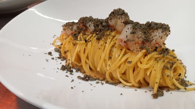 Tagliolino al nero di seppia pomodorini vongole e bottarga